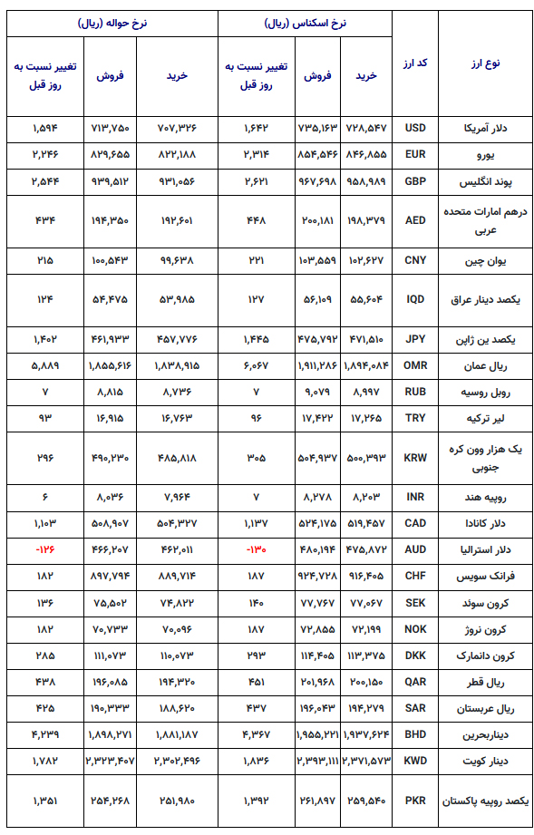 نرخ سایر ارزها و تغییرات آن به تفصیل در جدول زیر آمده است.