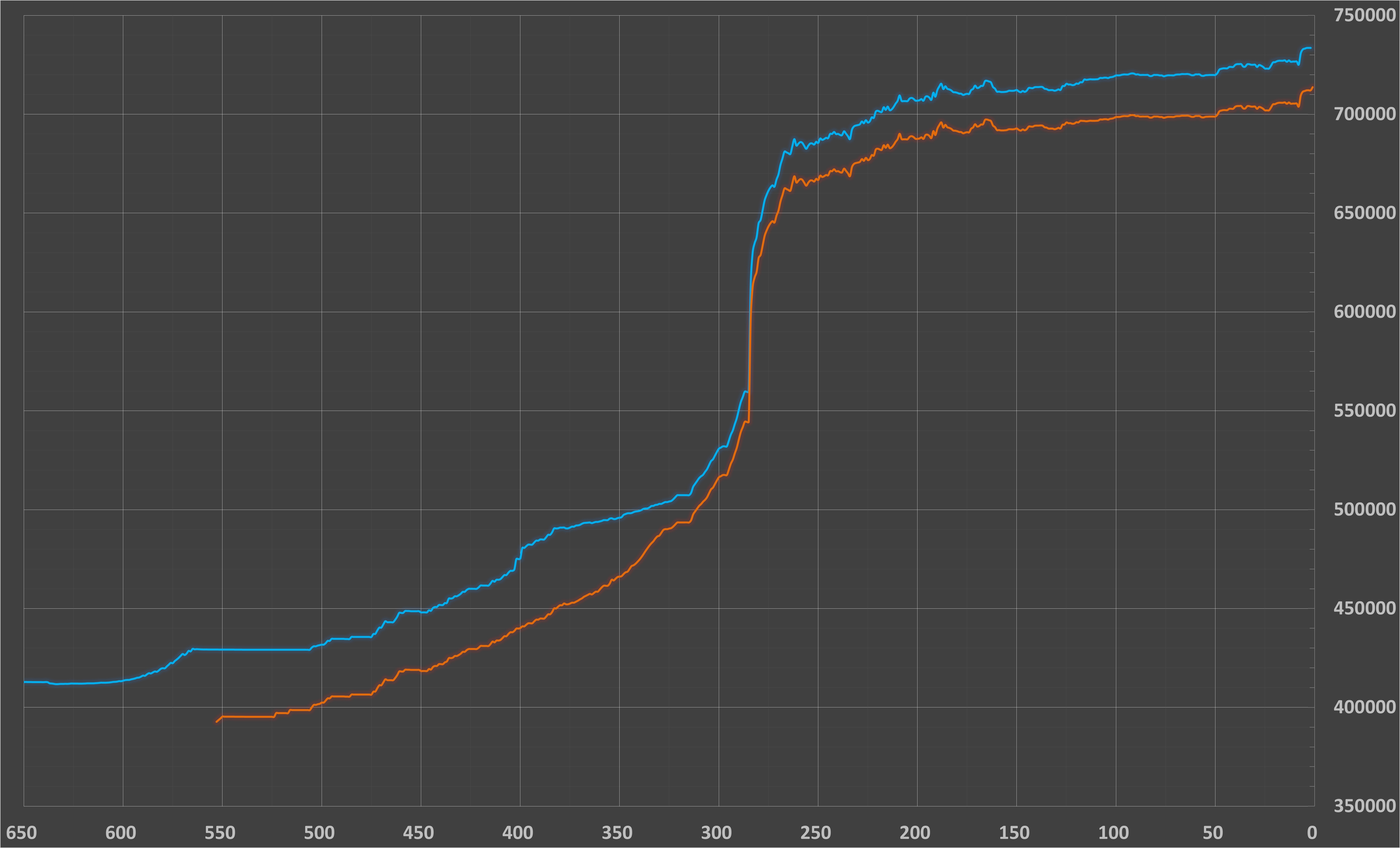 نمودار زیر روند افزایش قیمت اسکناس و حواله دلار آمریکا را در ۶۵۷ و ۵۵۴ روز کاری گذشته نشان می‌دهد. نمودار آبی نرخ اسکناس و نمودار نارنجی نرخ حواله دلار بر حسب ریال است.